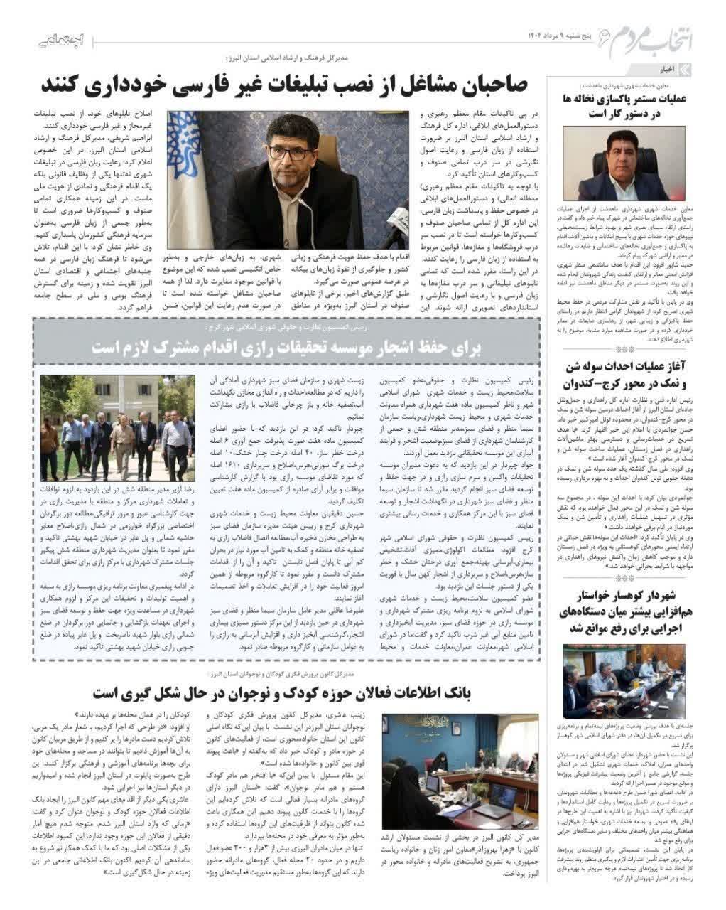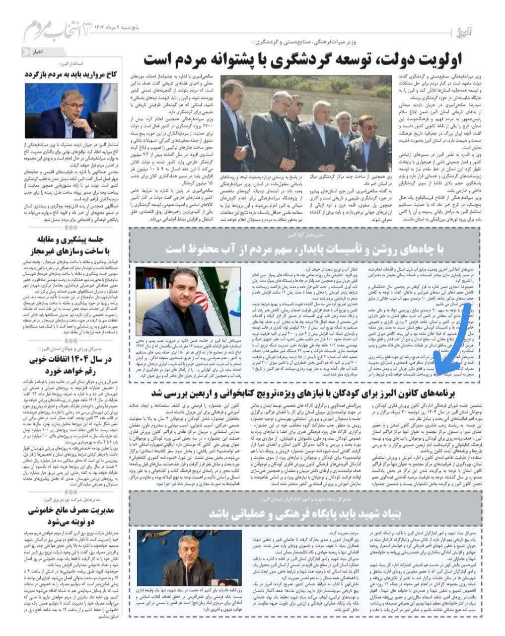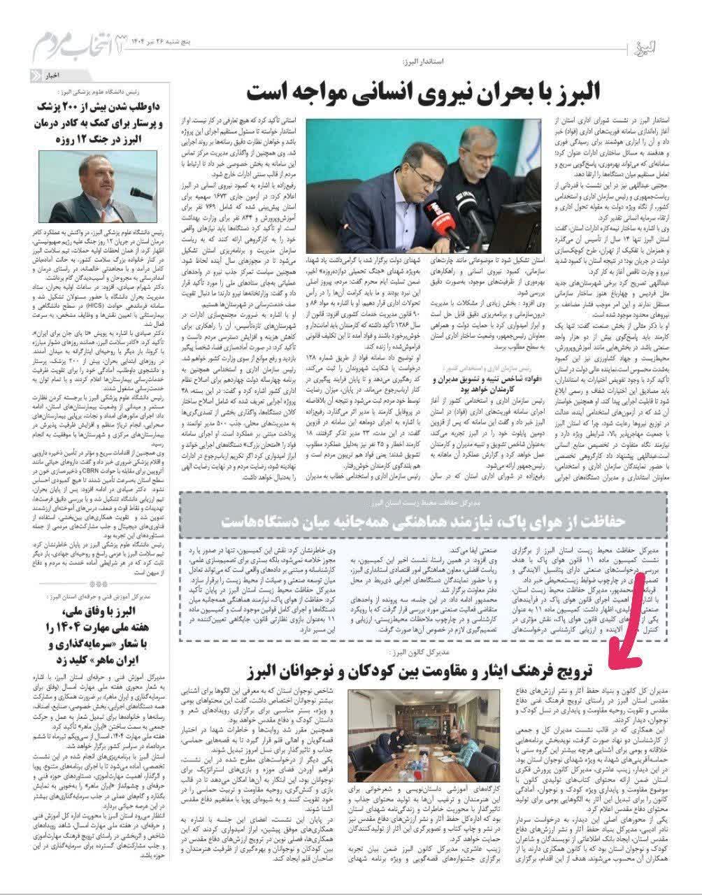 96 جلسه مسئولان فرهنگی با مسئولان مراکز کانون البرز روزنامه عصر آزادی 20 خرداد 1404 رسانه مکتوب (چاپی) 212840
