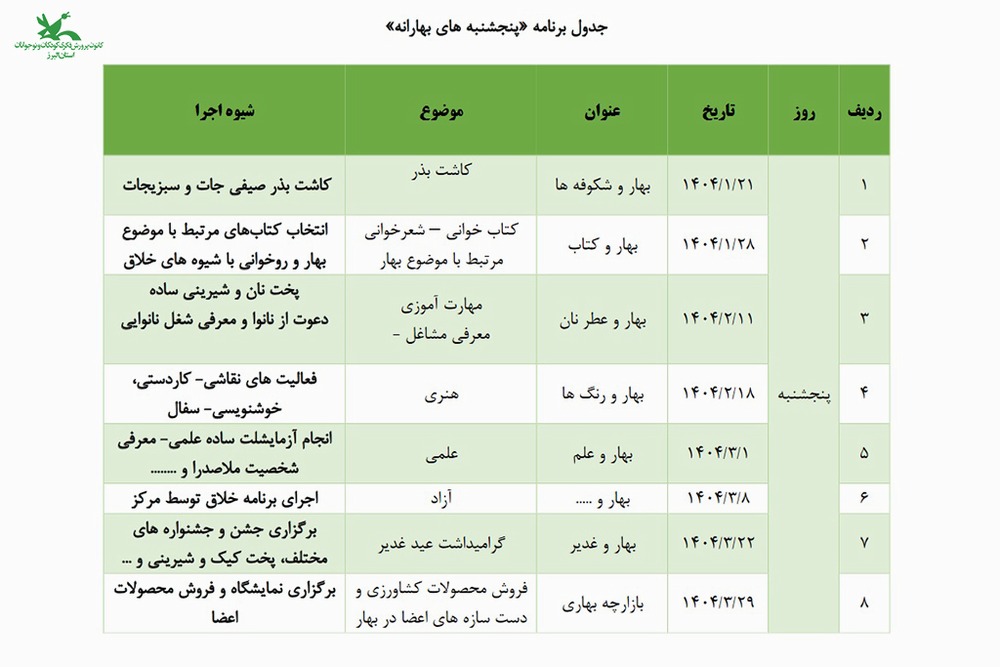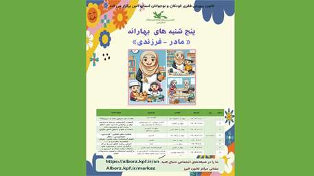بر این اساس در فصل بهار این مجموعه برنامهها با عنوان «پنجشنبههای بهارانه» کانون االبرز و با موضوعات مختلف در قالب وِیژه برنامه مادر – فرزندی، برگزار خواهد شد.