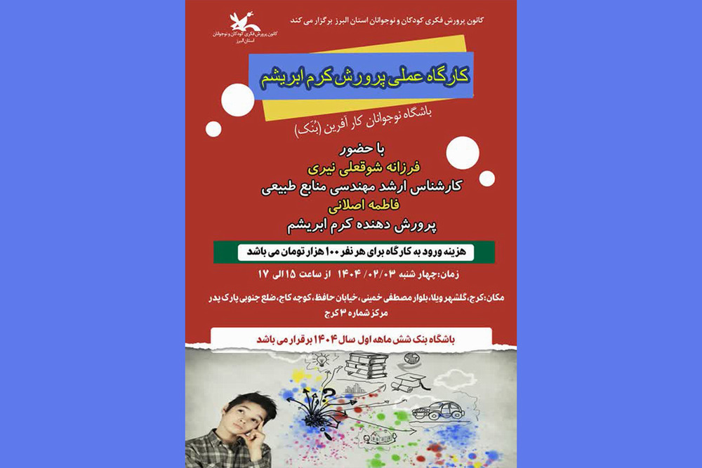 به گزارش روابط عمومی اداره کل کانون البرز، این کارگاه که با هدف آشنایی کودکان و نوجوانان با فرآیند تولید ابریشم و ایجاد زمینههای کارآفرینی با توجه به شعار سال «سرمایه گذاری برای تولید» برگزار میشود، روز چهارشنبه، ۳ اردیبهشت ۱۴۰۴، از ساعت ۱۵ الی ۱۷ در مرکز شماره ۳ کانون پرورش فکری کرج واقع در گلشهر ویلا، بلوار مصطفی خمینی، خیابان حافظ، کوچه کاج، ضلع جنوبی پارک پدر، برگزار خواهد شد..